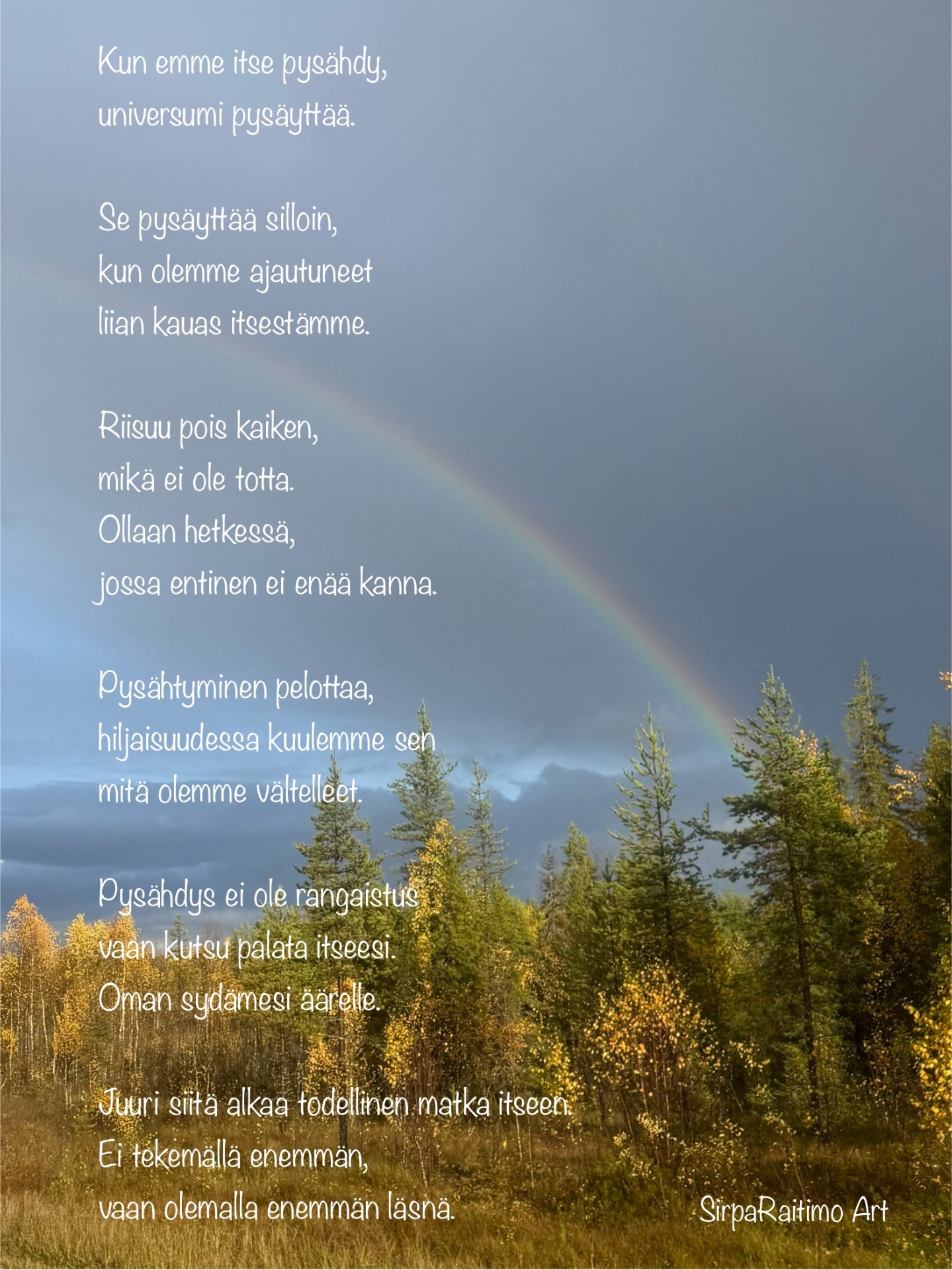 Me elämme ajassa, jossa pysähtyminen tuntuu väärältä ja jopa heikkoudelta. Kalenterit täyttyvät, tehtävälistat pitenevät ja hiljaisuus koetaan helposti tehottomuutena. Meille opetetaan jaksamaan, venymään ja menemään vielä vähän pidemmälle – vaikka keho ja mieli kuiskivat jo toista.