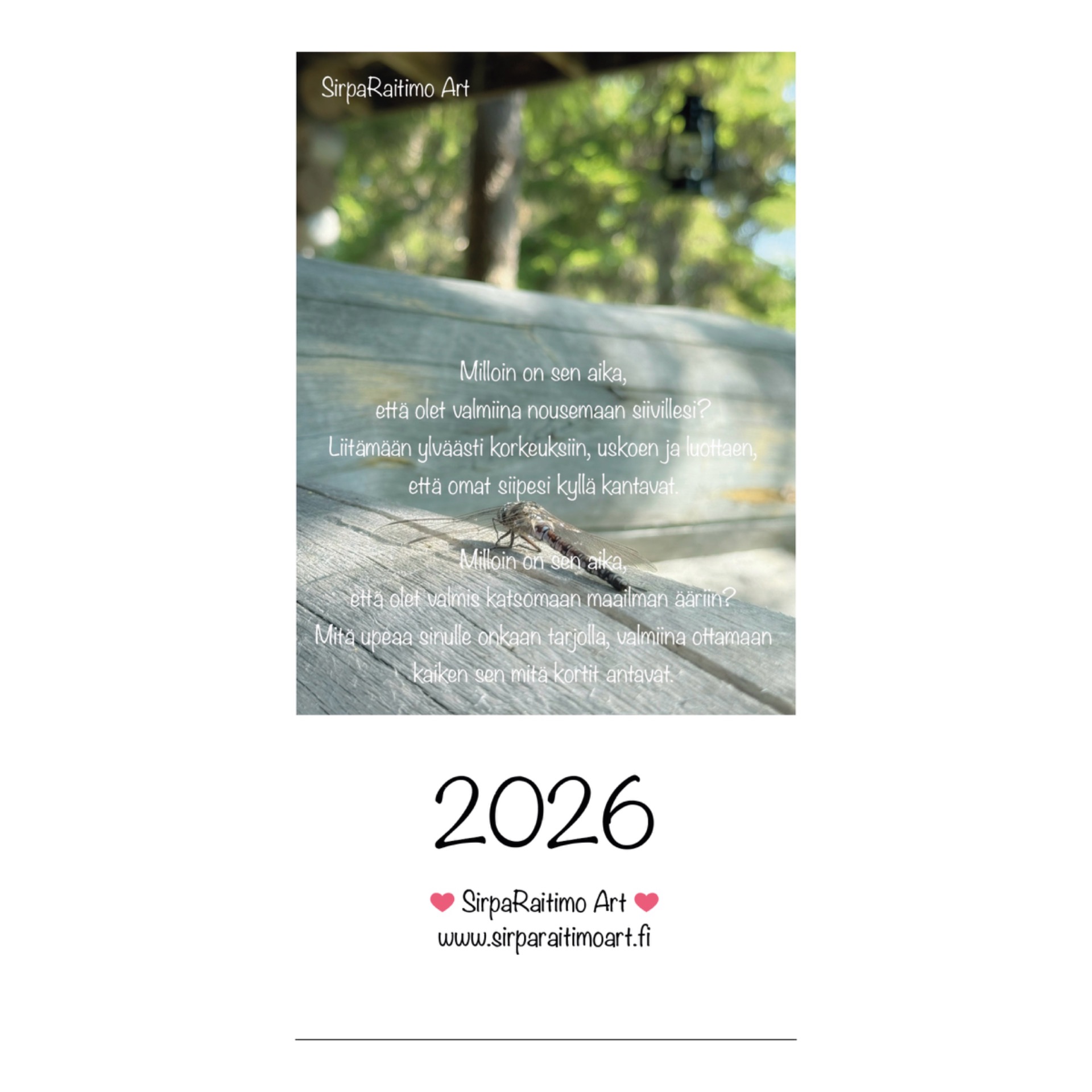 Vuoden 2026 seinäkalenteri. Koko 21 x 42 cm. Sisältää nimi- ja liputuspäivät, sekä joka kuukaudelle oman, ihanan kuvarunon.